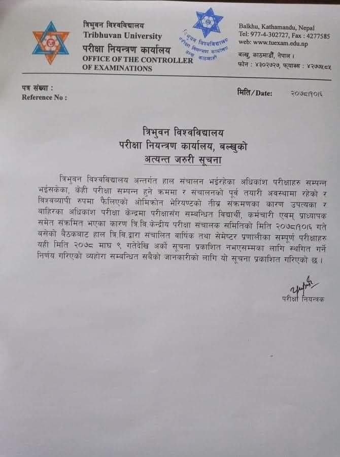 त्रिभुवन विश्वविद्यालयले पूर्वनिर्धारित सबै परीक्षा स्थगित गर्ने निर्णय गरेको छ। परीक्षा नियन्त्रण कार्यालयले बिहीबार एक सूचना जारी गर्दै माघ ९ गतेदेखि अर्को सूचना प्रकाशित नभएसम्मका लागि सबै परीक्षा स्थगित गर्ने निर्णय गरेको हो।